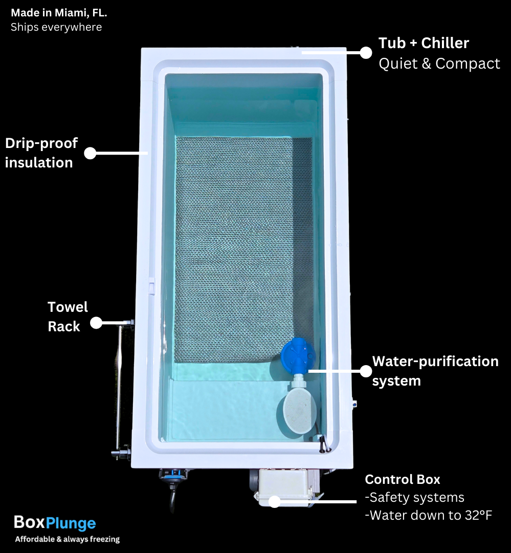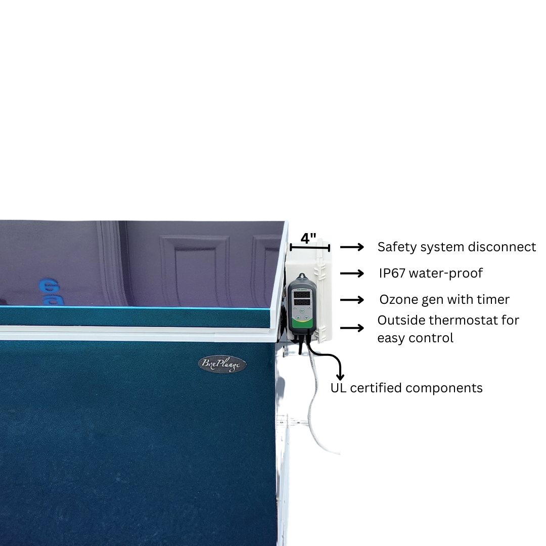 Equipped with a powerful ozone generator and activated carbon filter, our cold plunge ensures crystal clear and sanitary water for months on end. Our rubber-sealed lid boosts energy efficiency and delivers extra safety for you and your family. Furthermore, BoxPlunge's advanced foam insulation makes it the most energy-efficient cold plunge available in the market.
